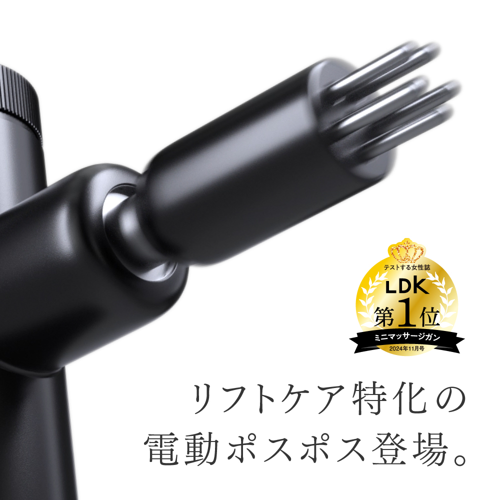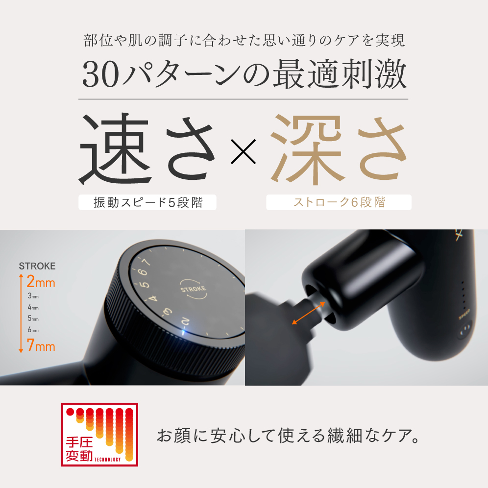 進化した電動ポスポスで、手軽に深動リフトケア。狙った部分をピンポイントで刺激できる「フェイスポイント」と、広範囲をしっかり刺激できる「ヘッドポイント」アタッチメント、アタッチメントの2種類を使い分けることで、頭皮や顔の表情筋へのさらに効率的なケアが可能になりました。速さと深さの両方をコントロールする「手圧変動テクノロジー」で、顔にも身体にもそれぞれに最適な30パターンの刺激を体感できます。
