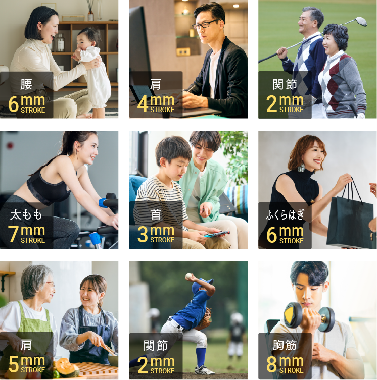 従来のマッサージガンでは刺激が強くて使いにくかった首などの繊細な部位にも、2mmストロークなら肌あたりの柔らかい刺激で心地良いケアが可能に。
